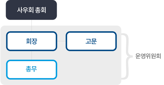 에스코컨설턴트 사우회는 원활하고 효율적인 운영을 위하여 운영위원회를 두며, 운영위원회는 총회에서 투표로서 선출된 회장과 회장이 임명한총무, 고문(전임회장)으로 구성되어 있습니다.