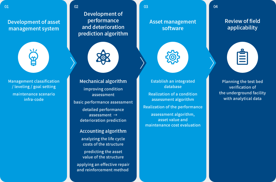 ESCO R&D Institute has an ongoing R&D Project entitled as “Development of a Maintenance Platform based on Asset Management for the Underground Structure of Plants and Large Scale Utilities.” Performance and deterioration prediction algorithm and establishment of an asset management system