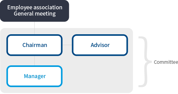ESCO’s Employees’ Association has a committee devoted to harmonious and effective management and consists of a chairman elected during a general meeting, a manager of general affairs and advisor (former chairman) who are appointed by the chairman.